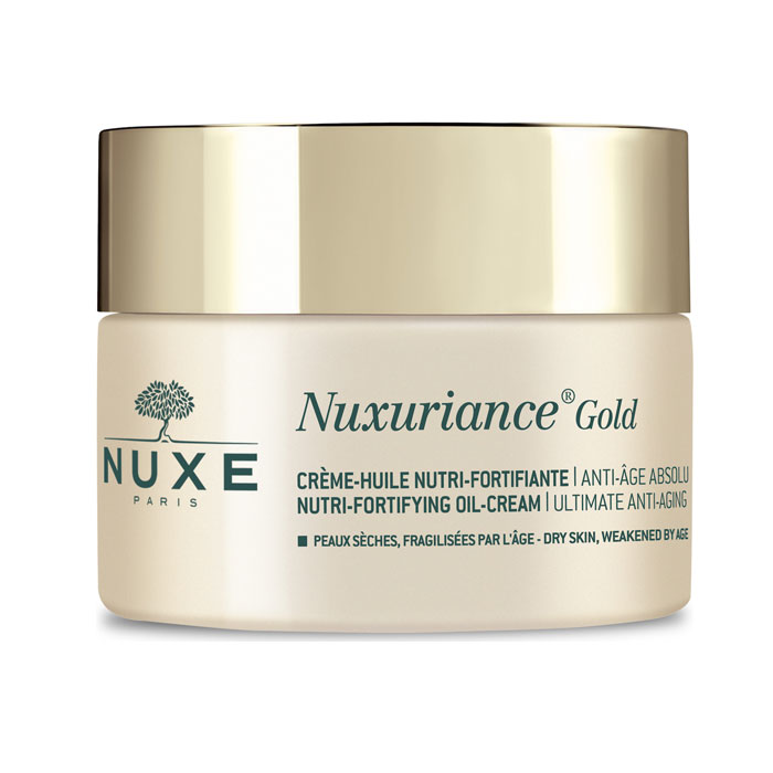 Κρέμα ημέρας Nuxe Nuxuriance Gold Nutri-Fortifying Oil-Cream 50ml Επαναπυκνώνει, θρέφει και επαναφέρει τη λάμψη της ξηρής επιδερμίδας που έχει αποδυναμωθεί με την ηλικία. Η επιδερμίδα φαίνεται ανανεωμένη και πιο δυνατή κάθε μέρα. Το απαλό εκχύλισμα λαδιού με βιομιμιτική υφή και εκχύλισμα βοτανικού ελαίου λιώνει στο δέρμα. Κάθε μέρα, δίνει δύναμη και λάμψη στο ξηρό δέρμα που είναι αδυνατισμένο από το χρόνο. Το δέρμα θεραπεύεται, αναζωογονείται και φαίνεται πιο φωτεινό μετά την πρώτη εφαρμογή. Μέρα με τη μέρα το δέρμα είναι πιο λαμπερό και οι ρυτίδες έχουν μαλακώσει.
